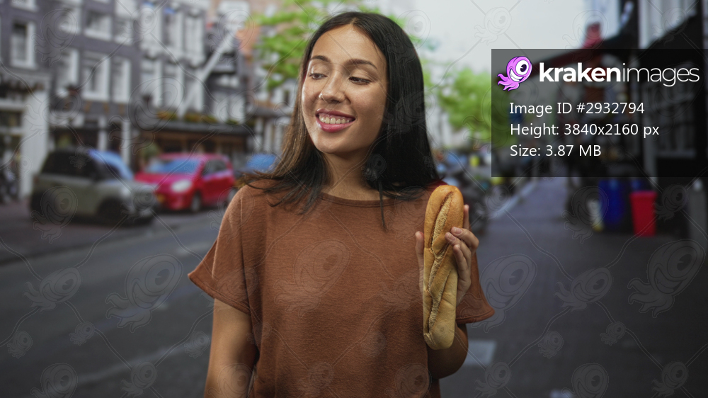 Hispanic young brunette woman smiling while holding a baguette on a city street with parked cars and brick buildings; contentment everyday life.
