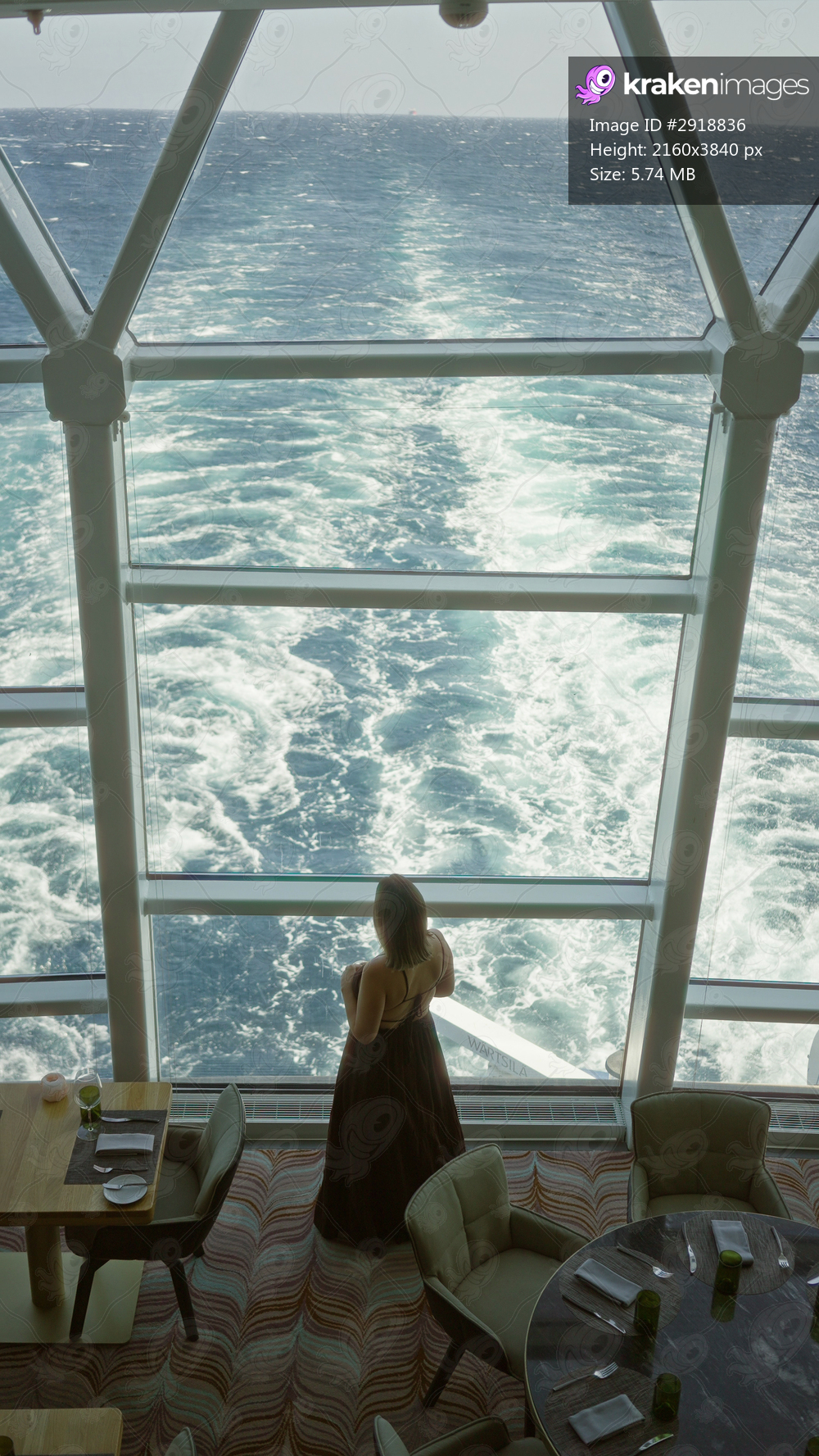 Hispanic young brunette woman standing by a large panoramic window looking at the ocean wake from a cruise ship inside building restaurant with table settings; serenity. - Kraken Images