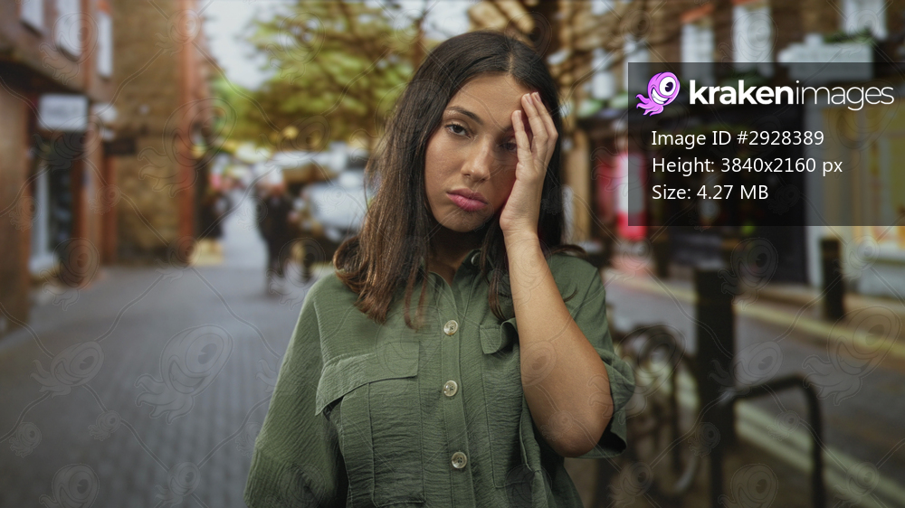 Hispanic young brunette woman touching forehead with hand on a city street wearing green shirt; weariness.