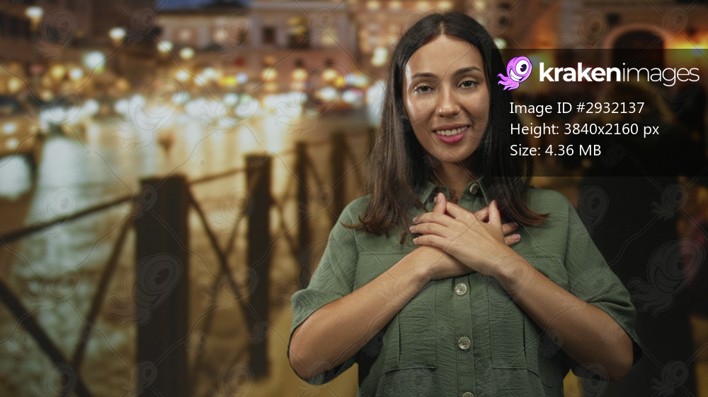 Hispanic young brunette woman touching hands to chest and smiling on a busy city street at night; gratitude warmth.