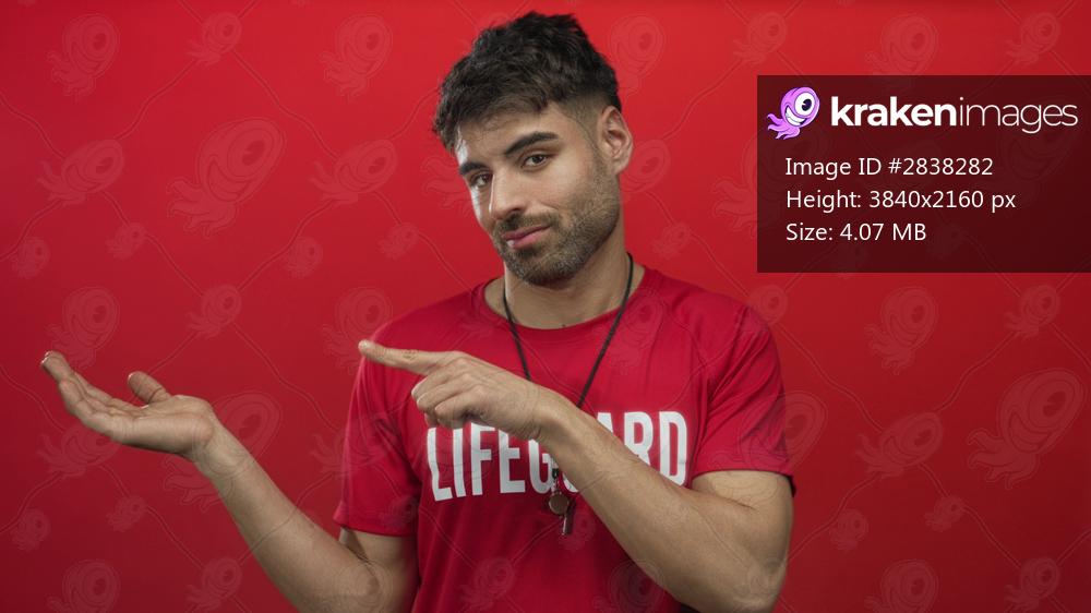 Hispanic young lifeguard man wearing red lifeguard shirt pointing finger to bare palm in red studio; focus.