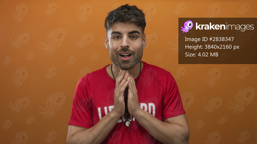 Hispanic young lifeguard man with whistle clasping hands and standing poised in studio; calm determination.