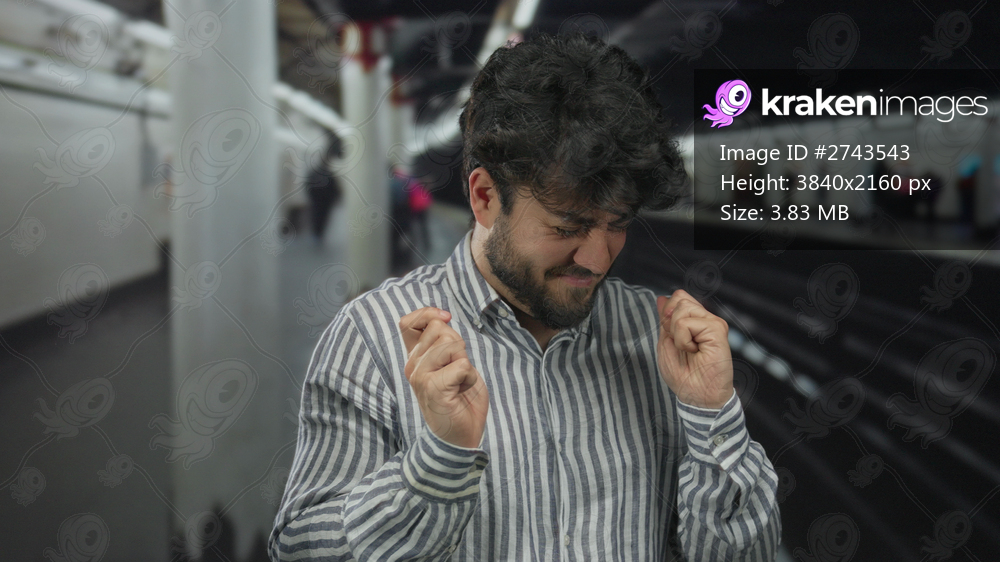 Hispanic young man with beard showing a displeased expression at an indoor railway train station setting under artificial lighting and blurred background. - Kraken Images
