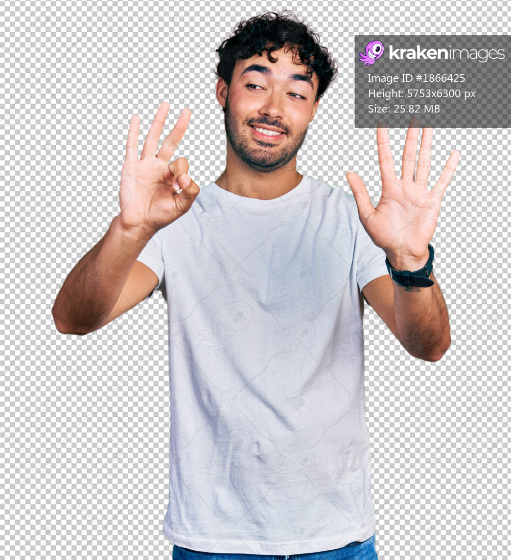 Hispanic young man with beard wearing casual white t shirt showing and pointing up with fingers number eight while smiling confident and happy.