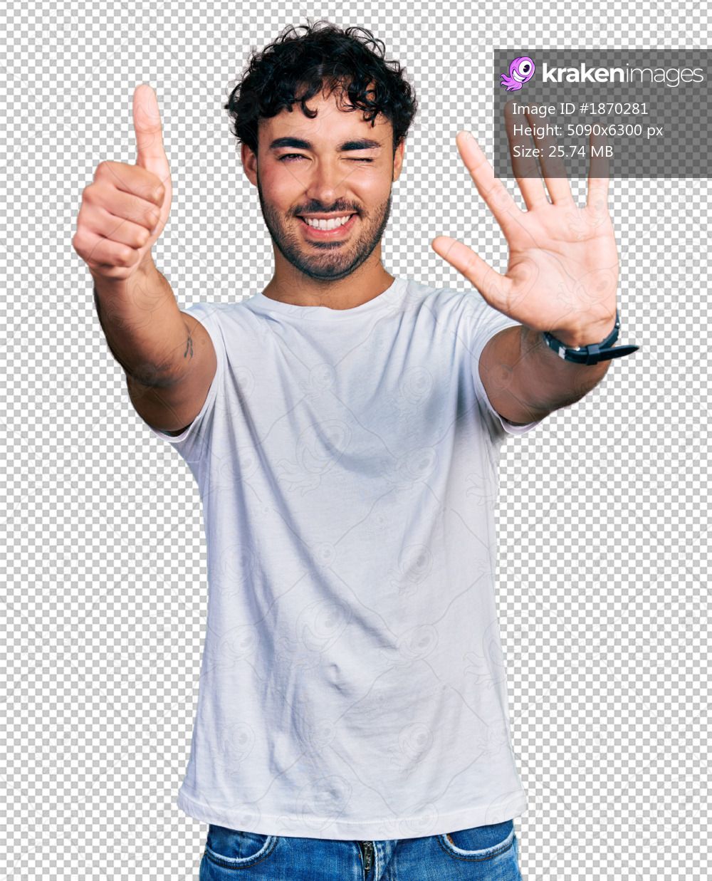 Hispanic young man with beard wearing casual white t shirt showing and pointing up with fingers number six while smiling confident and happy.