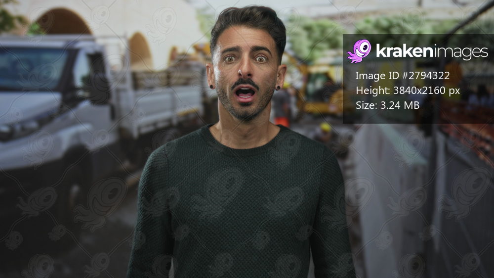 Hispanic young man clenches fists and flashes a joyful grin before a building under construction; triumph.