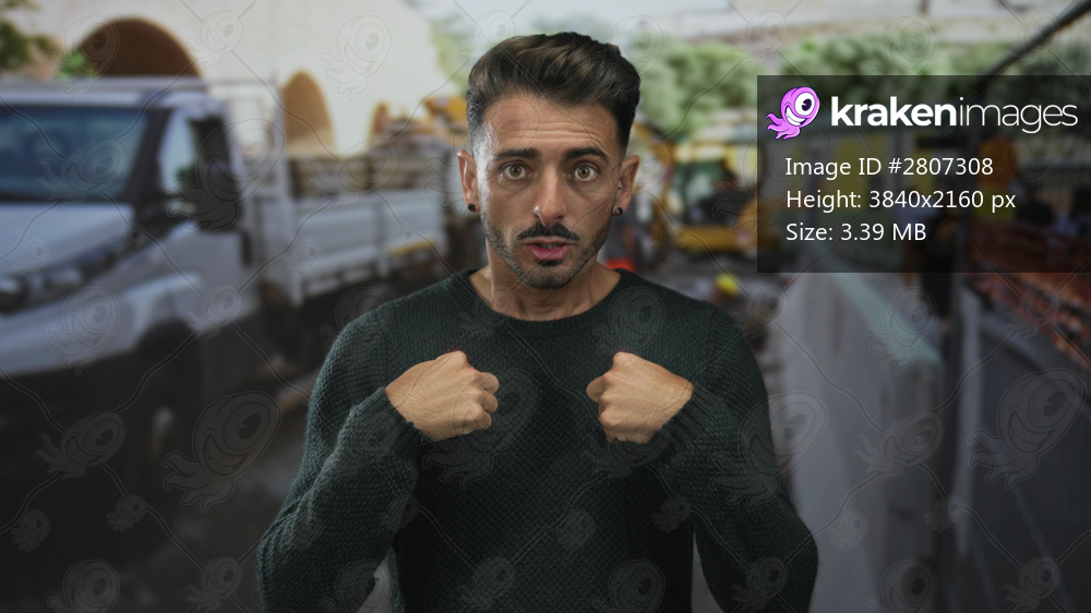 Hispanic young man clenches fists and flashes a joyful grin before a building under construction; triumph.