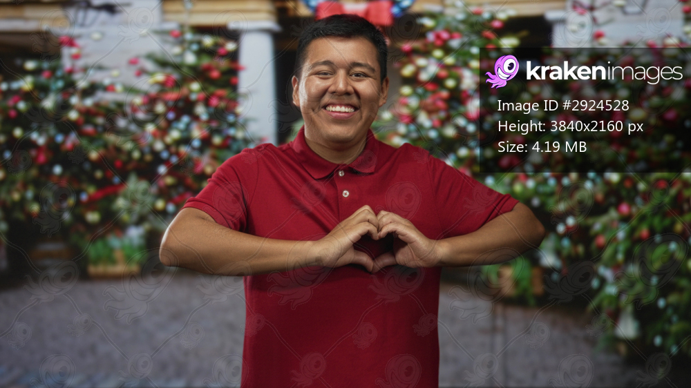 Hispanic young man forming heart with hands on street near decorated christmas trees; holiday love joy.