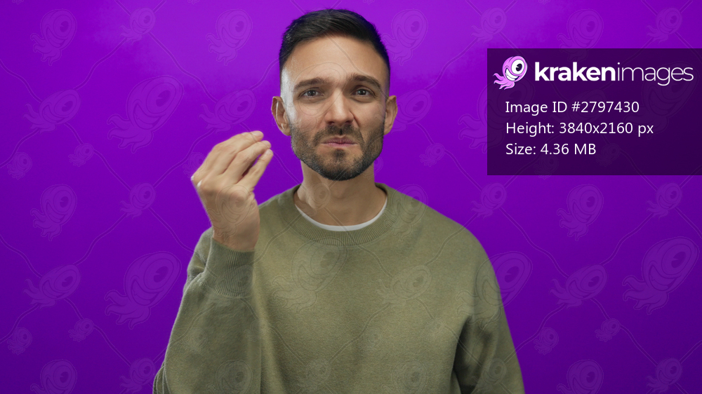 Hispanic young man gesturing with his hands against a vivid purple background, showcasing an expressive pose in a casual setting wearing a green sweatshirt under studio lighting. - Kraken Images