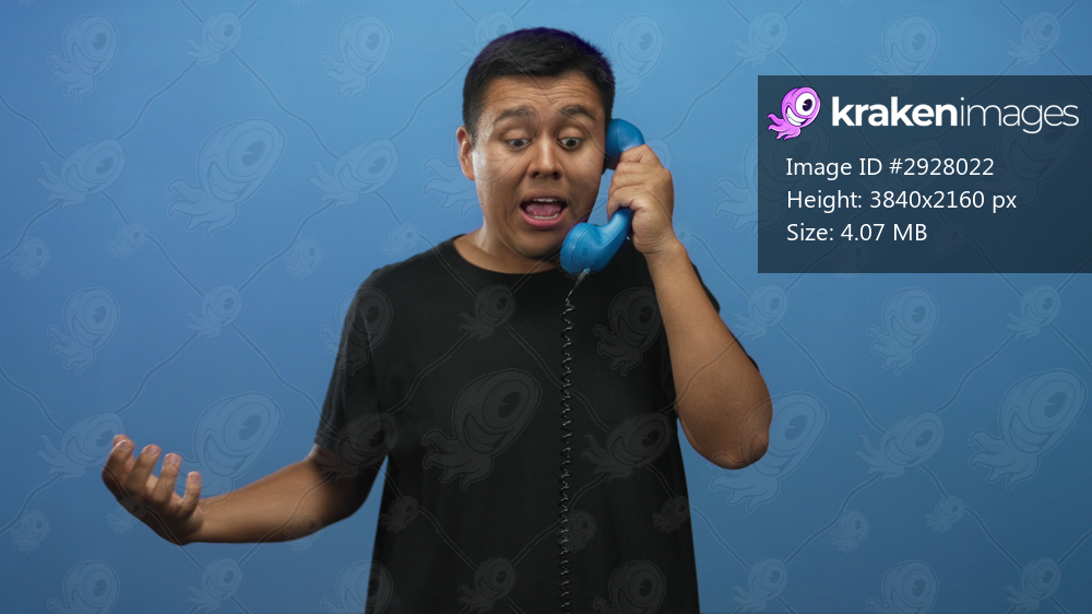 Hispanic young man holding a blue handset to his ear and gesturing while speaking in a blue studio setting; playful excitement.