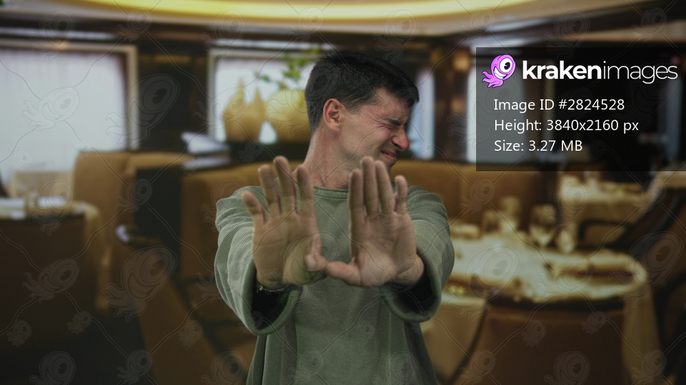 Hispanic young man holds both hands forward for stop gesture while standing by restaurant table; rejection refusal denial boundary.