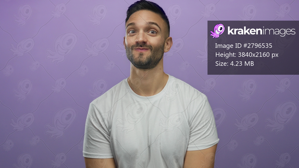 Hispanic young man in a white shirt making air quote gesture against a purple background, exuding a playful and skeptical expression.
