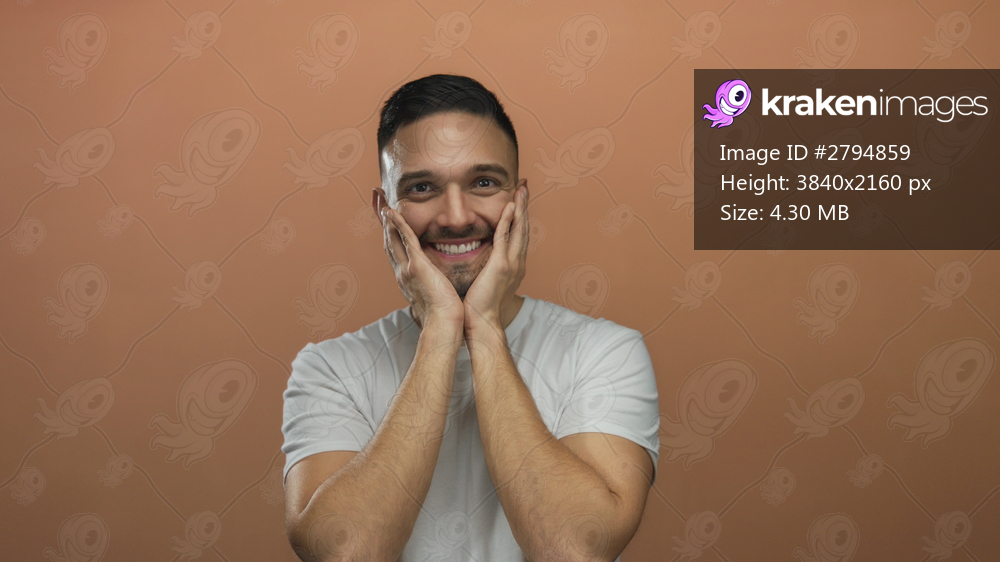 Hispanic young man in casual white shirt with short hair smiling against orange background conveying positivity and energy