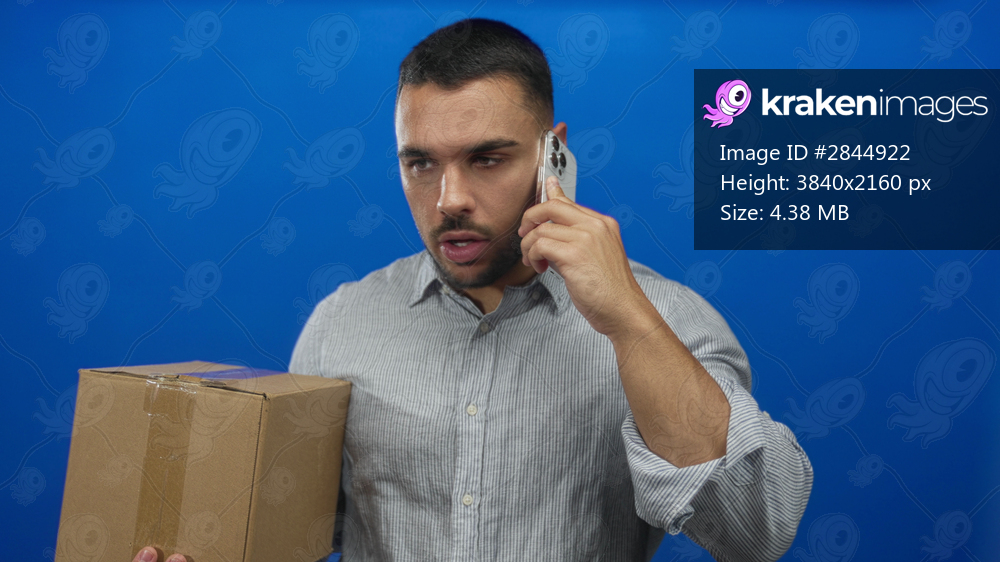 Hispanic young man in striped shirt holds a taped cardboard shipping box and talks on smartphone in blue studio; concentration.