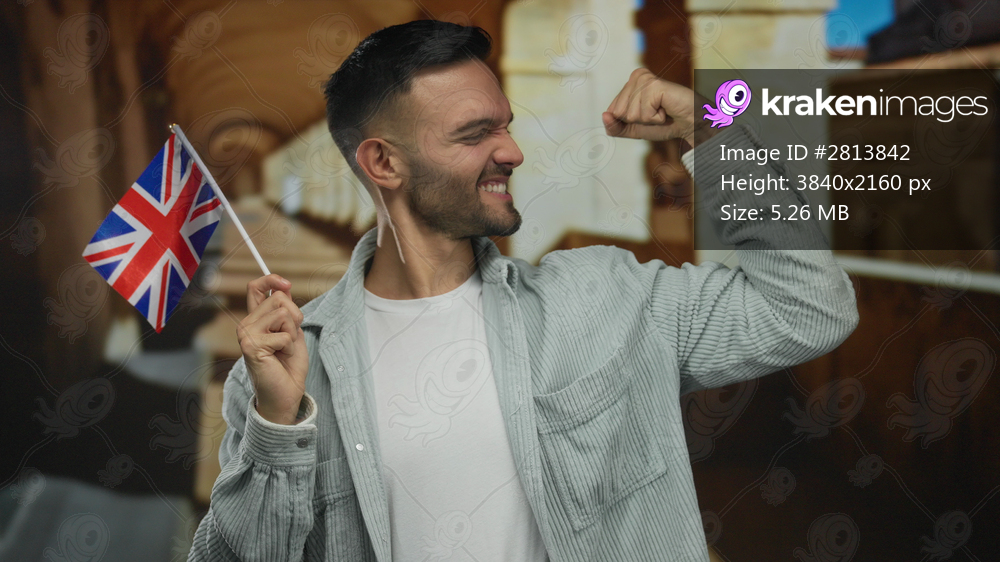 Hispanic young man on university campus joyfully holds uk flag and flexes arm in celebration.