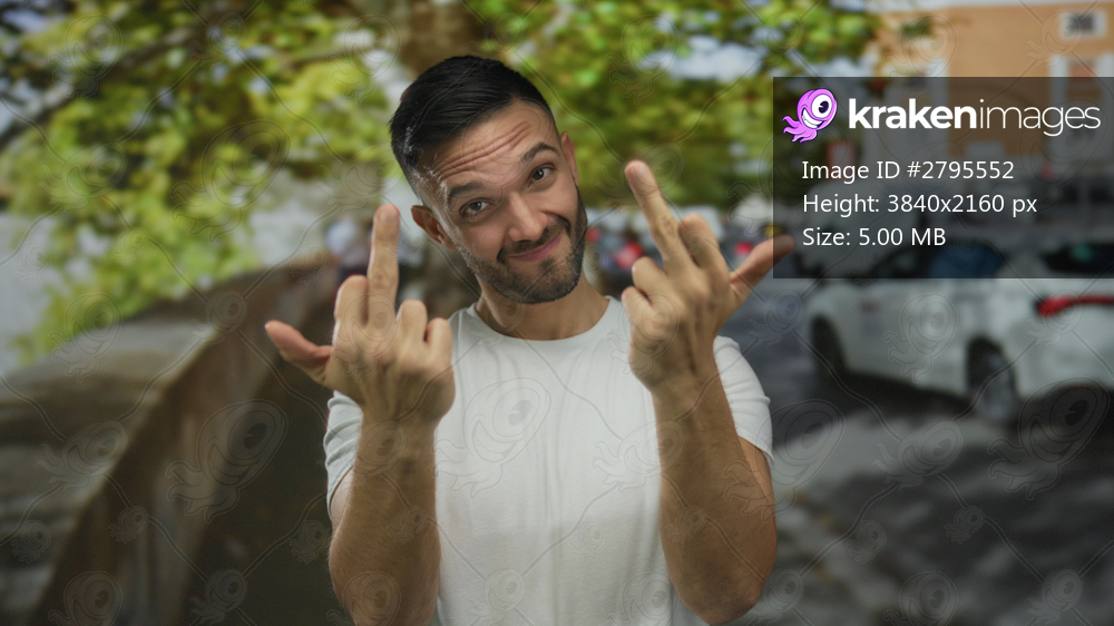 Hispanic young man outdoors on city street making rude hand gesture with middle fingers raised, casual attire, vibrant urban background with trees and vehicles visible. - Kraken Images