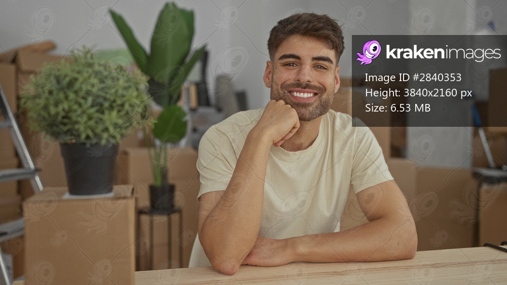 Hispanic young man rests chin on hand in newly unpacked home filled with stacked moving boxes and green houseplants; contemplation.
