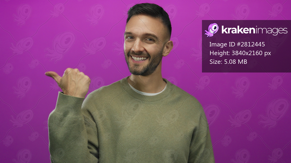 Hispanic young man smiling and pointing his thumb sideways against a vibrant pink background, wearing a casual sweater, exuding positivity in a studio setting. - Kraken Images