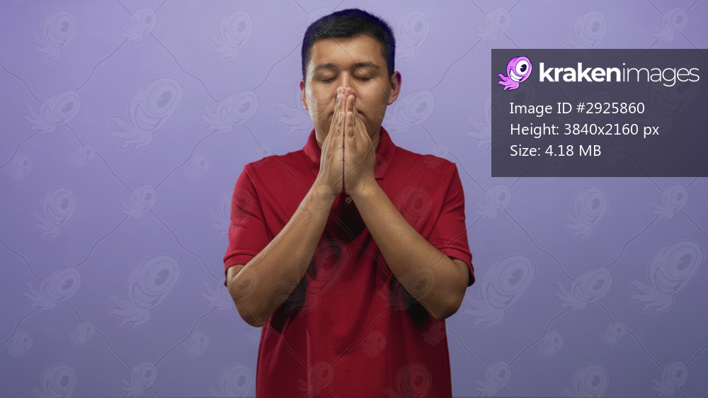 Hispanic young man wearing a red polo with hands pressed together praying in a purple studio setting; calm reflection.