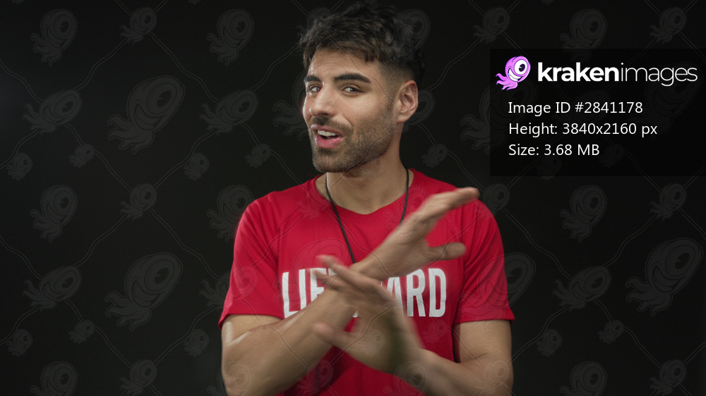 Hispanic young man wearing a whistle necklace and red lifeguard shirt spreads arms in studio; alertness.