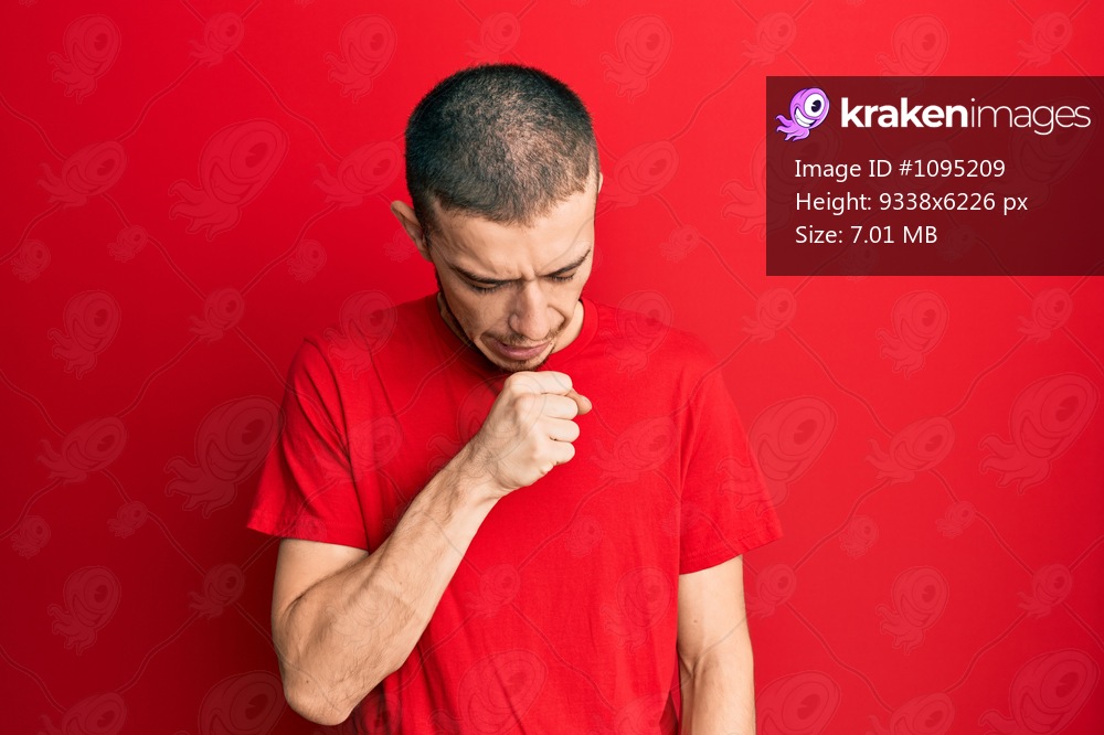 Hispanic young man wearing casual red t shirt feeling unwell and coughing as symptom for cold or bronchitis. health care concept.
