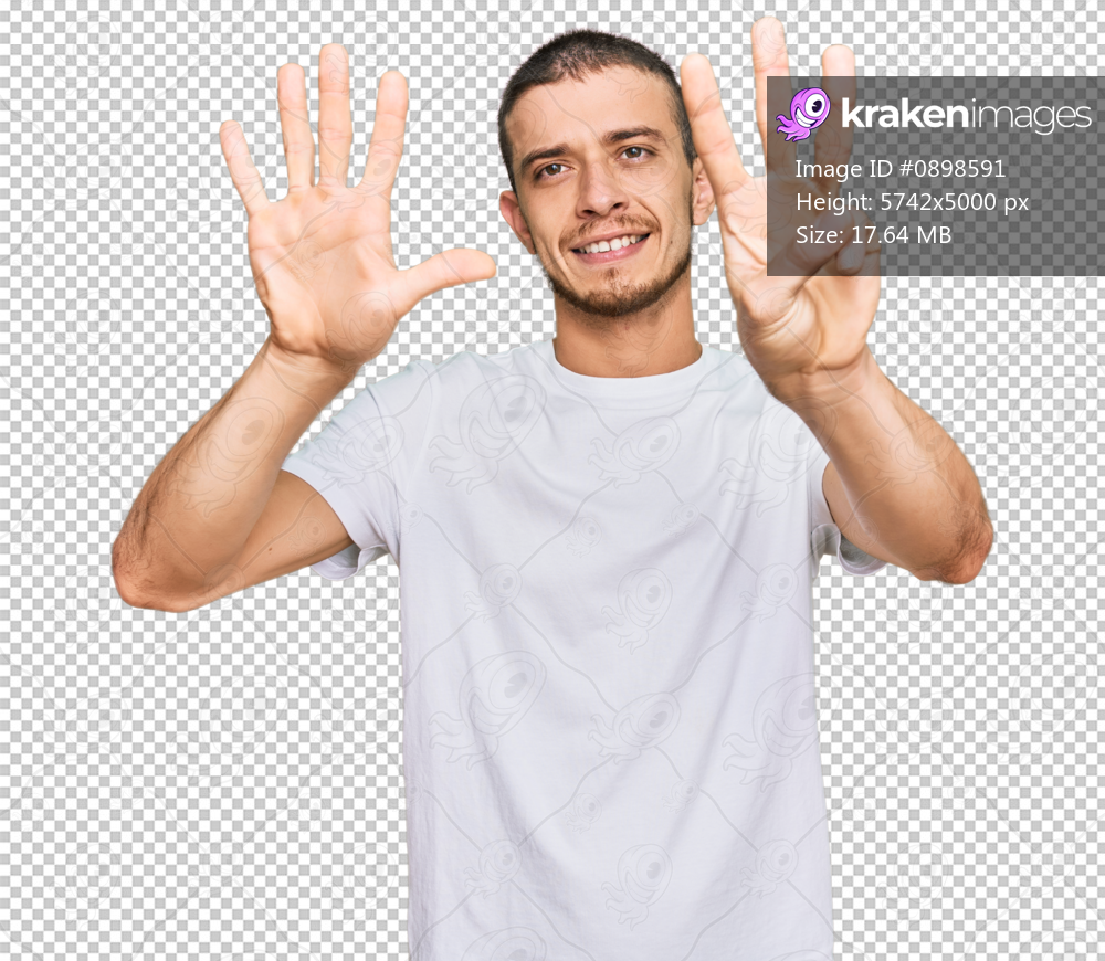 Hispanic young man wearing casual white t shirt showing and pointing up with fingers number eight while smiling confident and happy.