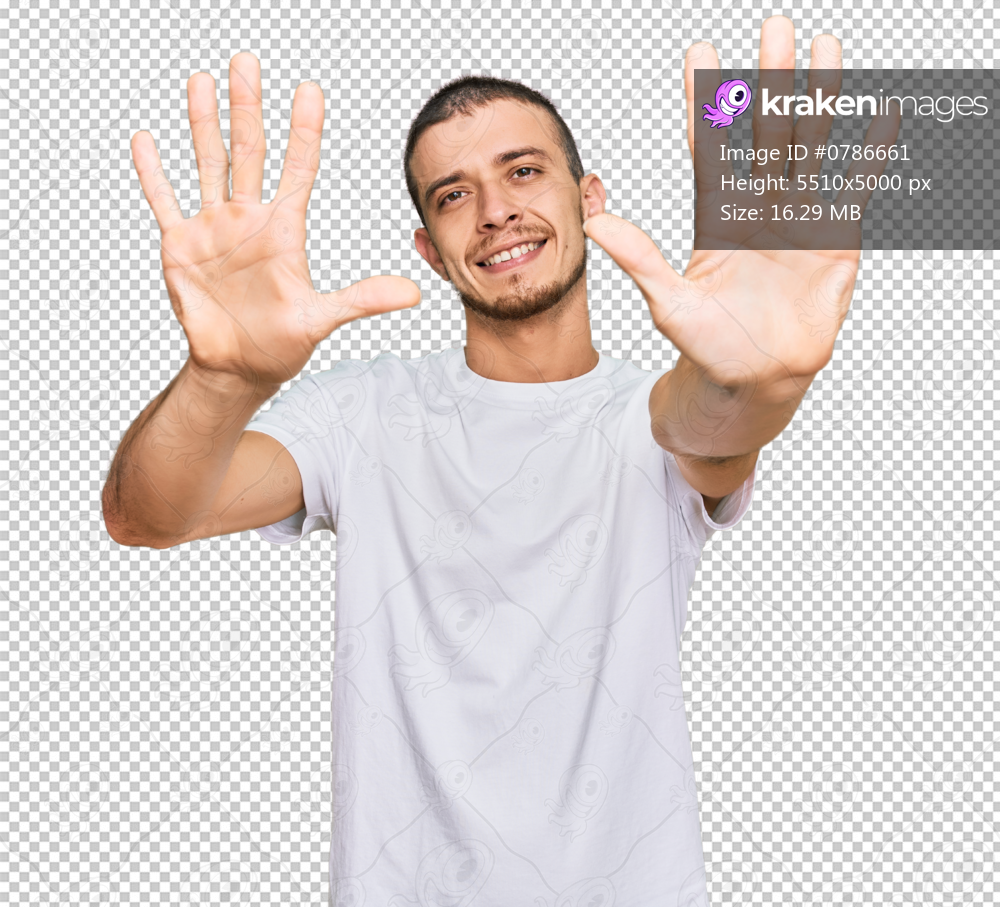 Hispanic young man wearing casual white t shirt showing and pointing up with fingers number ten while smiling confident and happy.
