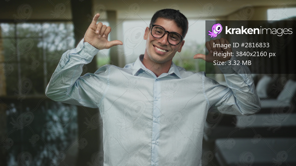 Hispanic young man wearing glasses and blue shirt points thumbs to chest in spa building; confidence self esteem growth.