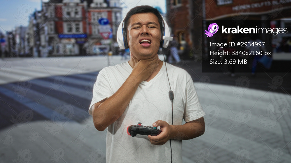 Hispanic young man wearing headset holding game controller with hand on throat on street; discomfort frustration gaming.