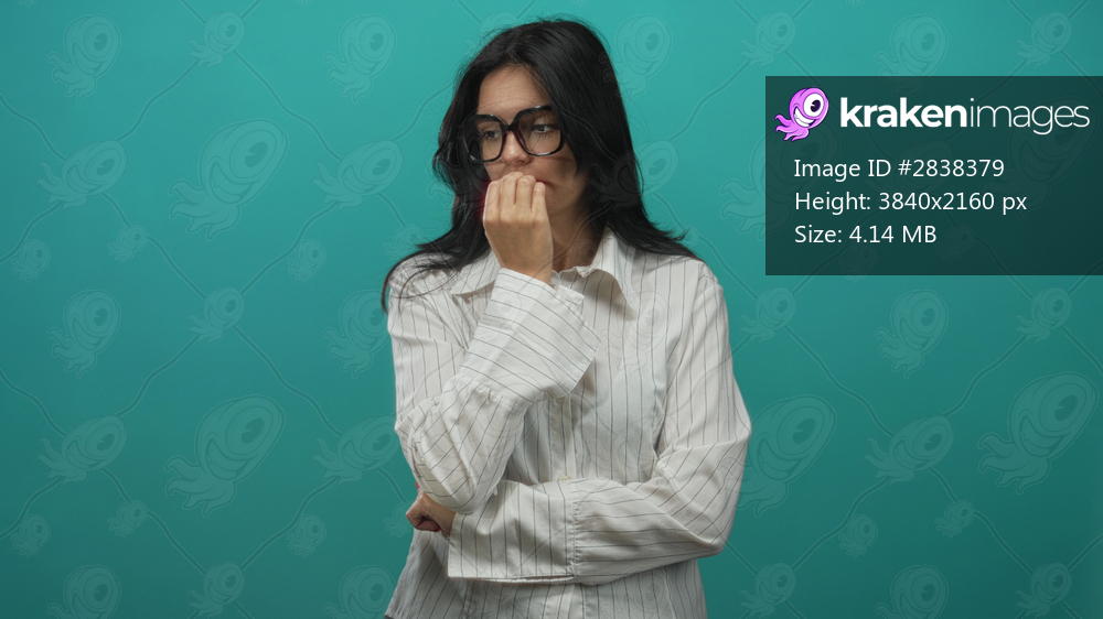 Hispanic young woman biting nails wearing glasses and striped shirt in studio; anxiety worry doubt contemplation.