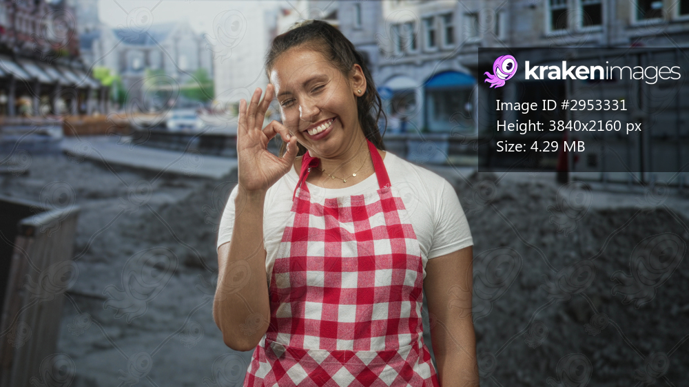 Hispanic young woman cook making ok sign with hand in front of construction building, wearing red gingham apron and white tee, smiling at camera; warm approval. - Kraken Images