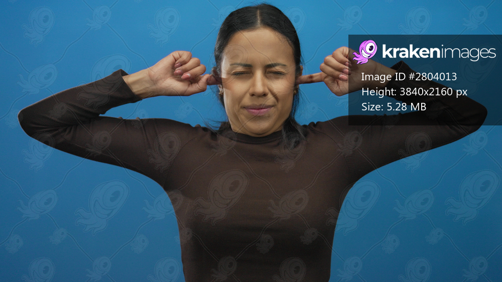 Hispanic young woman covers ears in front of an isolated blue background wall, expressing annoyance with a facial expression and open arms in a brown shirt. - Kraken Images