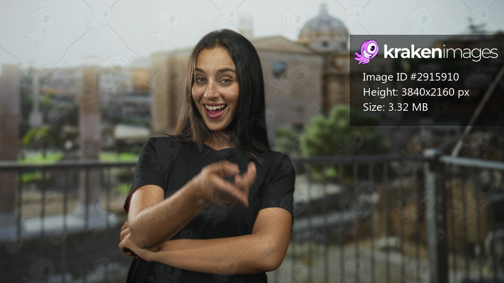 Hispanic young woman with crossed arms and a smile points finger to face on a building terrace overlooking roman ruins; confidence.