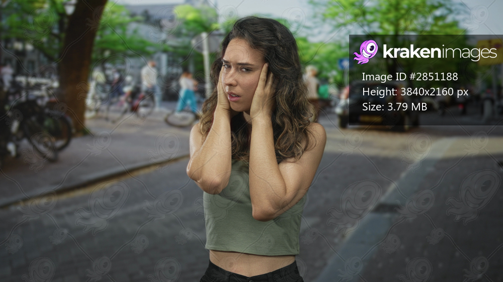 Hispanic young woman cups ears with hands amid bustling city street traffic and passing bicycles; noise frustration overwhelm.