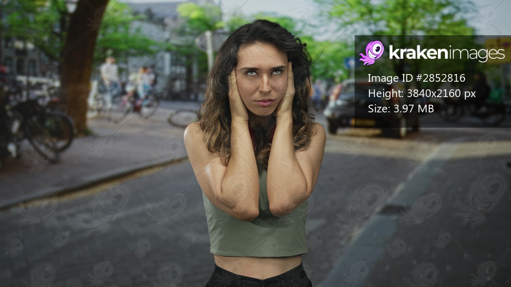 Hispanic young woman cups ears with hands amid bustling city street traffic and passing bicycles; noise frustration overwhelm.