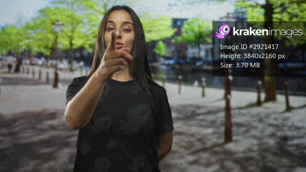 Hispanic young woman finger to lips for silence on street by canal wearing black t shirt smiling with closed eyes; quiet playful secret.