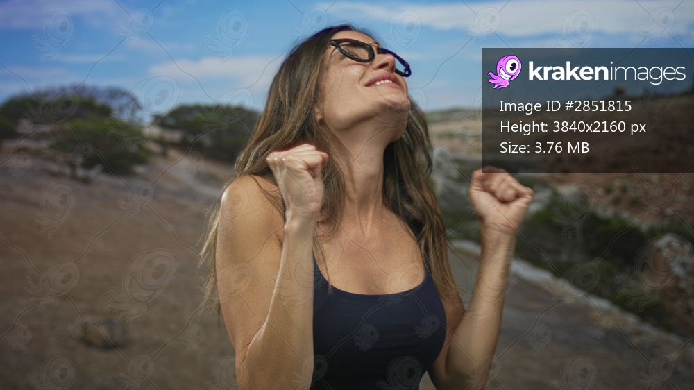 Hispanic young woman with glasses clenches fists and beams on a street in bright sunlight; triumph.