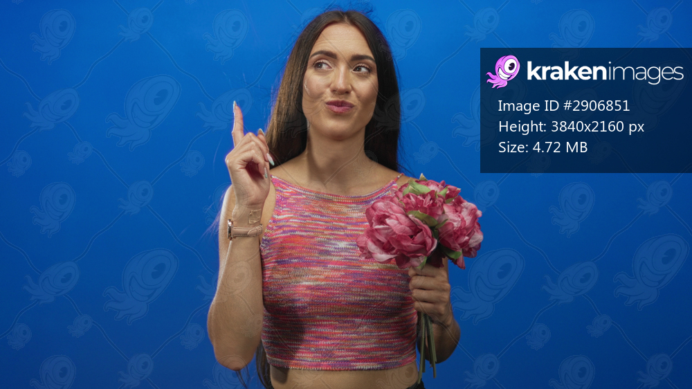Hispanic young woman holding pink peony bouquet points finger up in studio looking at camera; romance playful.