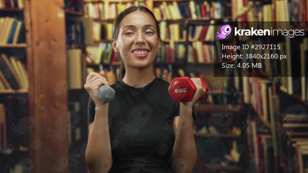 Hispanic young woman holding red and gray dumbbells, smiling and lifting weights among bookshelves in a library building; study fitness joy.