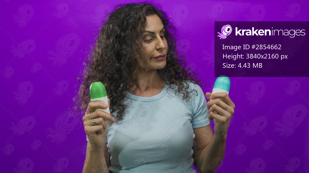 Hispanic young woman holds two roll on deodorant bottles in purple studio; uncertainty freshness choice.