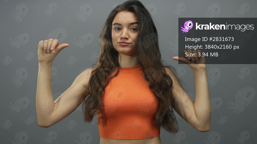Hispanic young woman in orange crop top points thumbs to chest in grey studio; confidence self esteem empowerment.