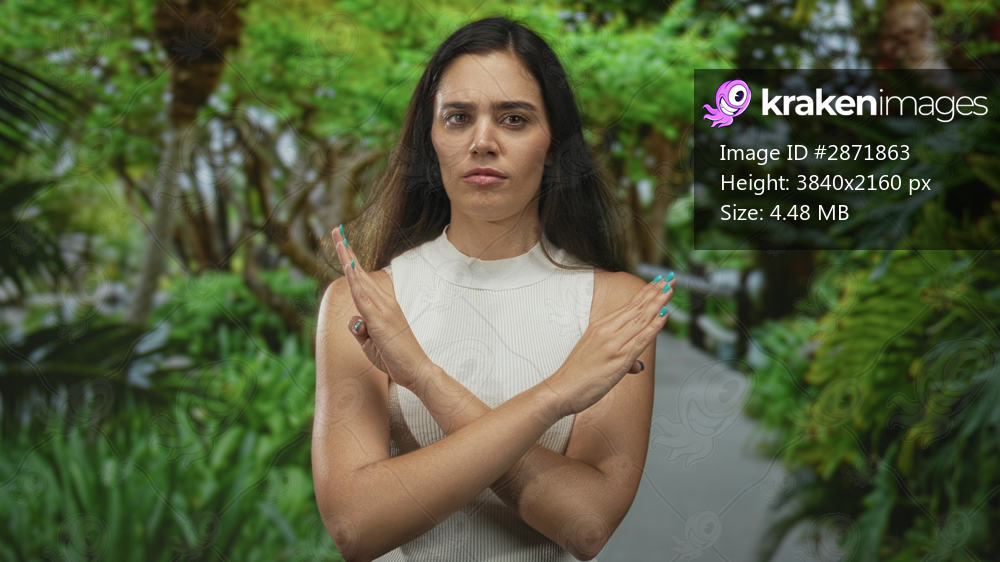 Hispanic young woman in sleeveless white top stands with arms crossed gesture in green forest; rejection.
