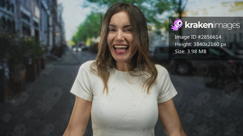 Hispanic young woman laughing with open mouth and wide smile on busy city street; happiness vitality.