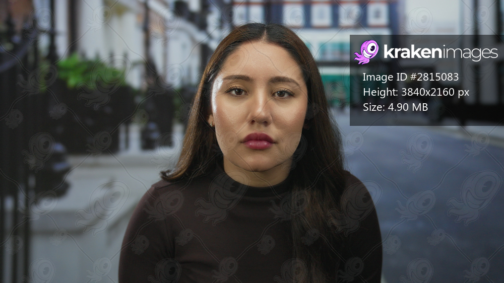 Hispanic young woman with lips closed looking directly at camera on a bustling city street; calmness.