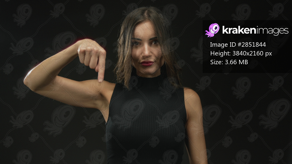 Hispanic young woman raising fist and pointing finger downward with open mouth showing bare arms in black studio; confidence.