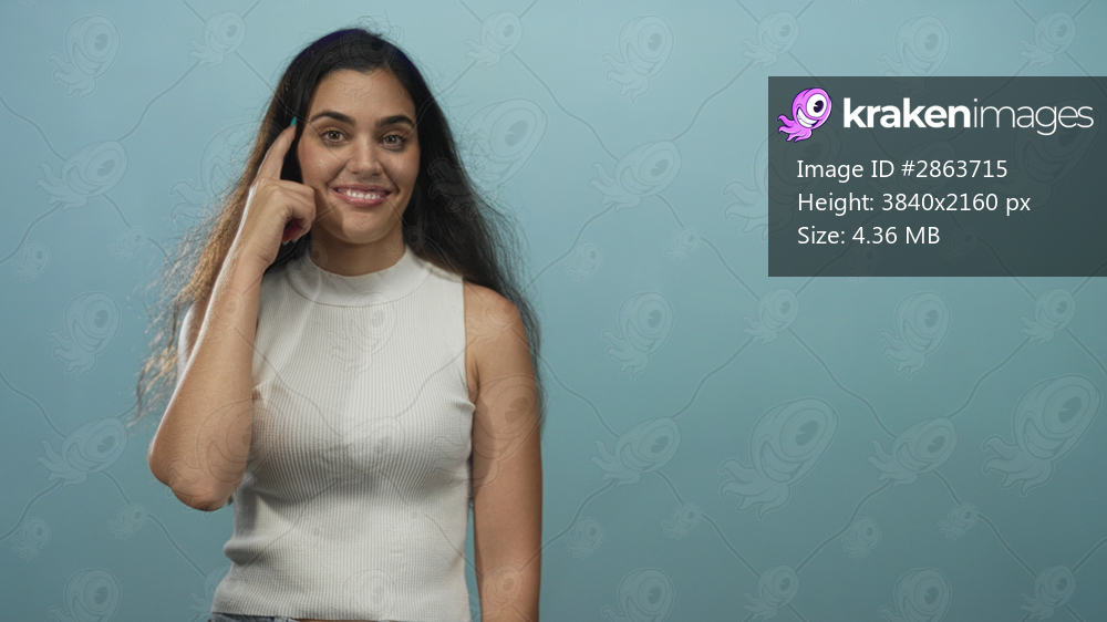Hispanic young woman smiling broadly while pointing finger to head in studio against blue wall; inspiration.