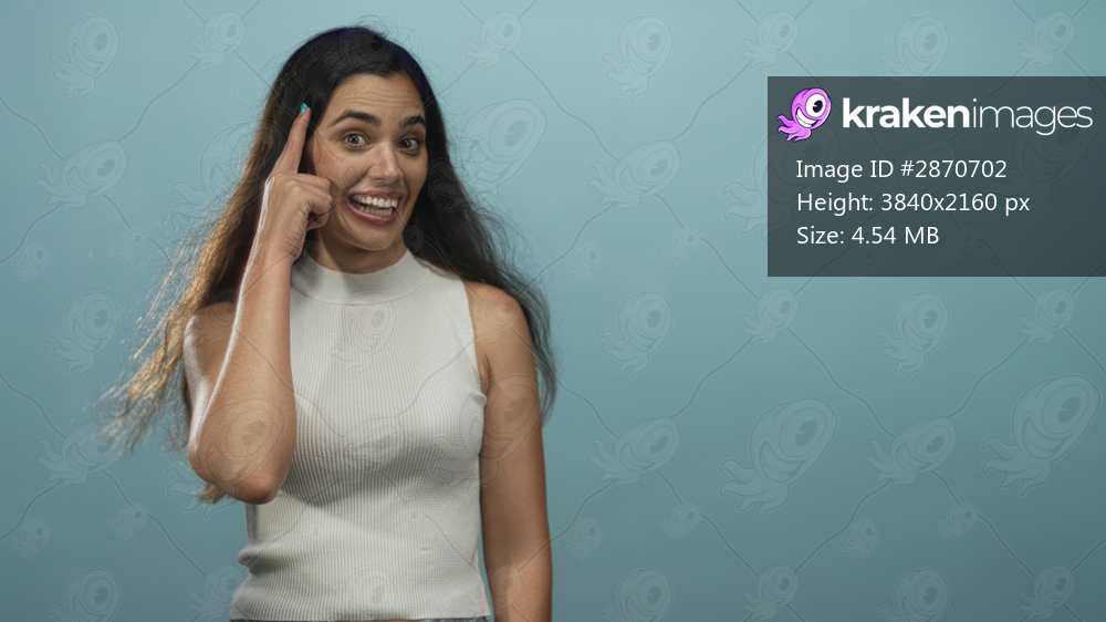 Hispanic young woman smiling broadly while pointing finger to head in studio against blue wall; inspiration.