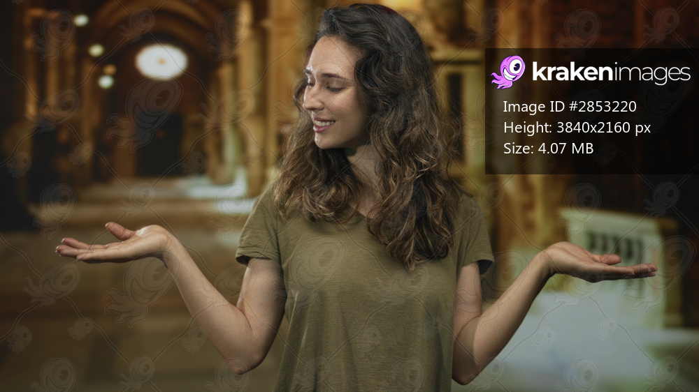 Hispanic young woman smiling holds arms out in sunlit church interior with vaulted arches and glowing lamps; serenity.