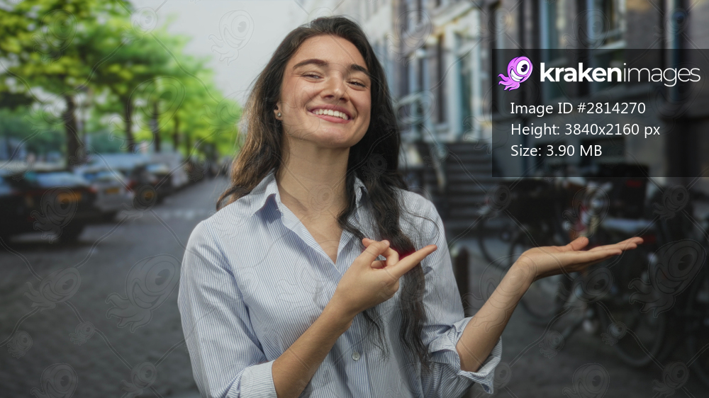 Hispanic young woman smiling and making ok sign while presenting a palm on a cobblestone city street; confidence.
