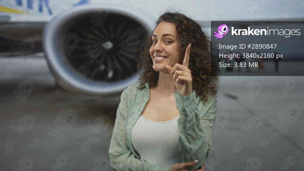 Hispanic young woman smiling points finger up while standing on airport tarmac by airplane engine; confidence travel planning.